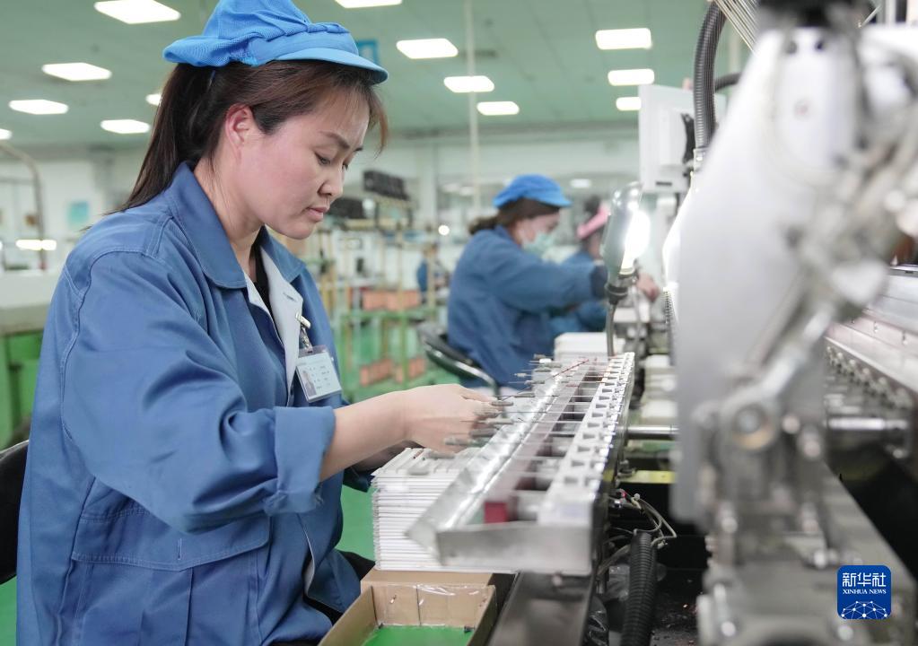 4月9日,工人在河北省青龍滿族自治縣青龍鎮逃軍山村一家電子產品企業的生產車間工作。