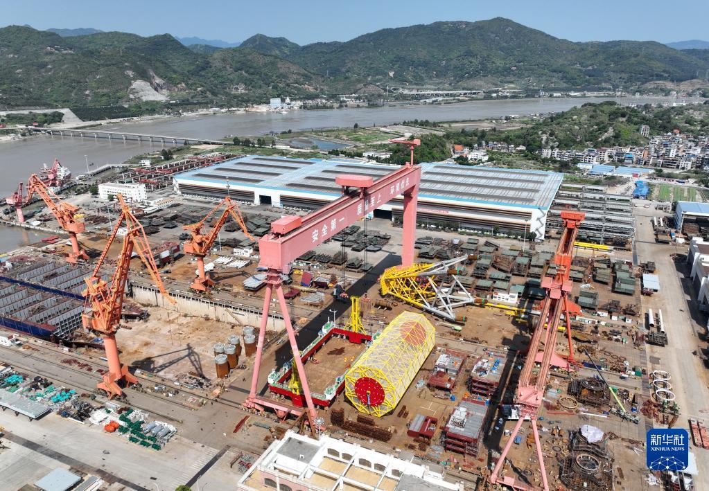 4月9日在馬尾造船股份有限公司總組場地拍攝的“乾動2號”深遠海養殖平臺(無人機照片)。