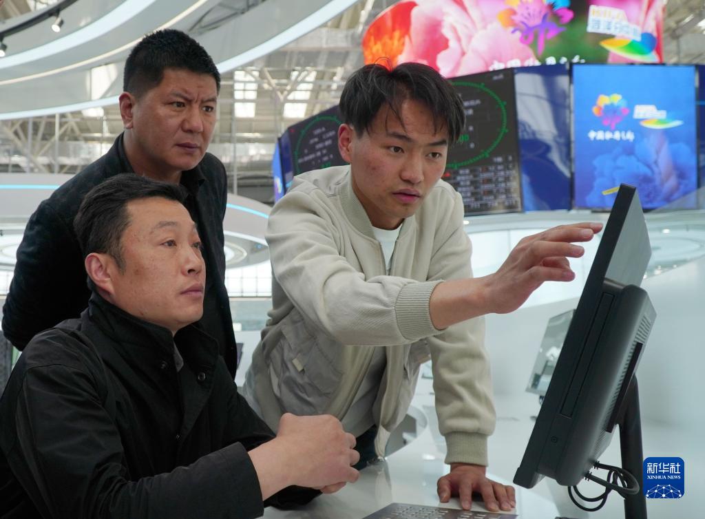 4月9日,在昆明國際花卉拍賣交易中心菏澤分中心,參觀者在了解花卉拍賣系統。