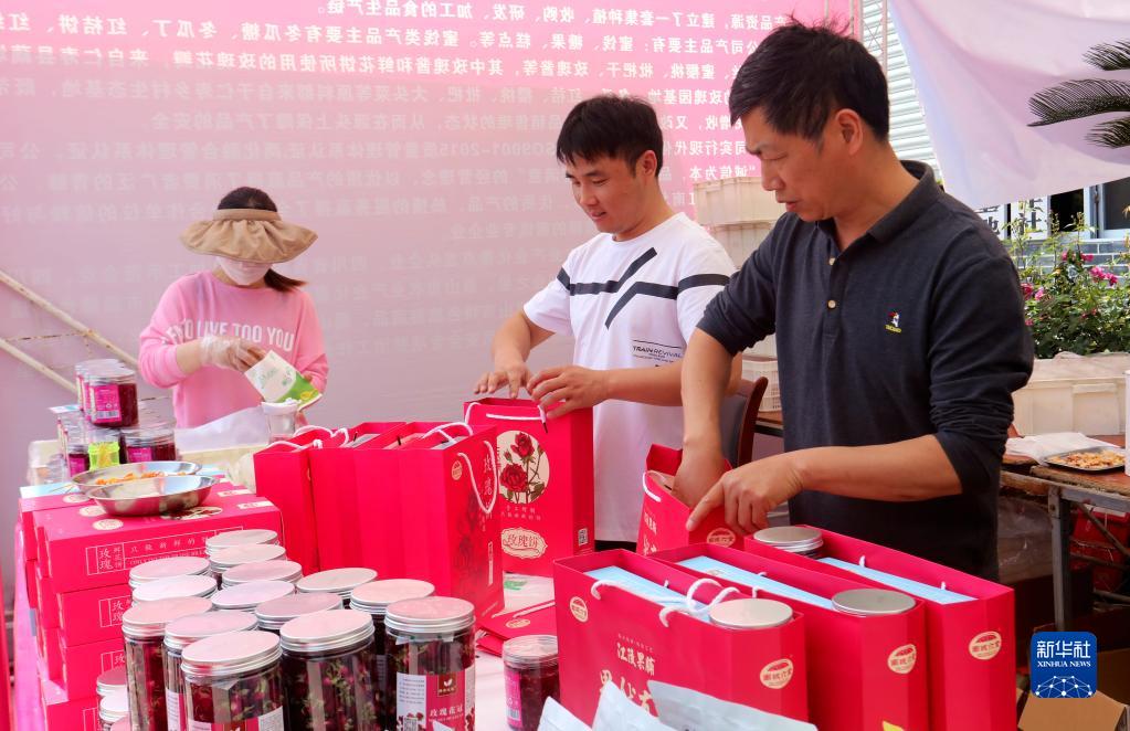 4月9日,游客在四川省眉山市仁壽縣藕塘鎮食用玫瑰種植基地購買玫瑰花產品。
