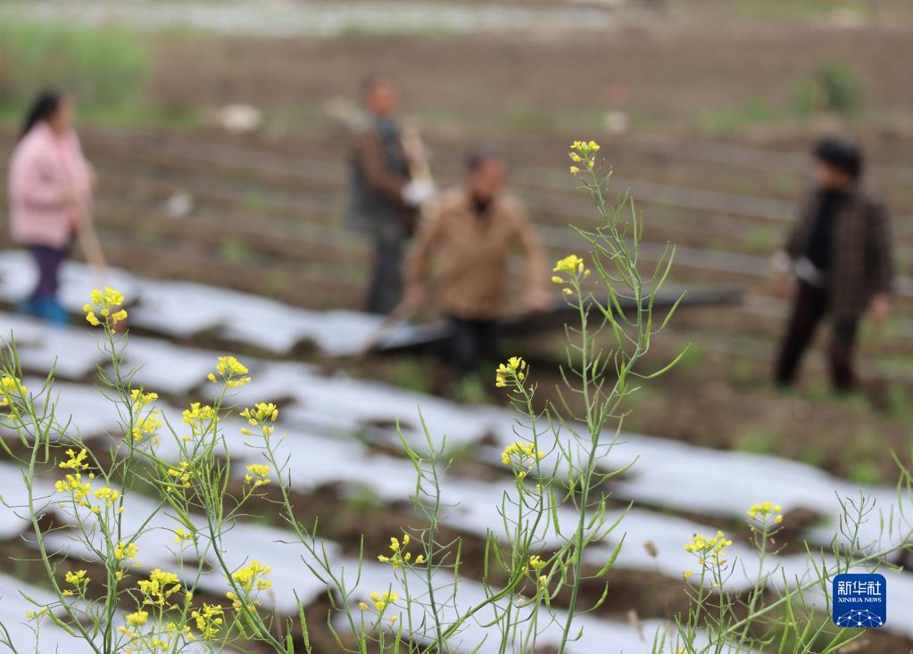 4月9日,在湖南省邵陽市城步苗族自治縣儒林鎮清溪村,農民在蔬菜種植基地里勞作。