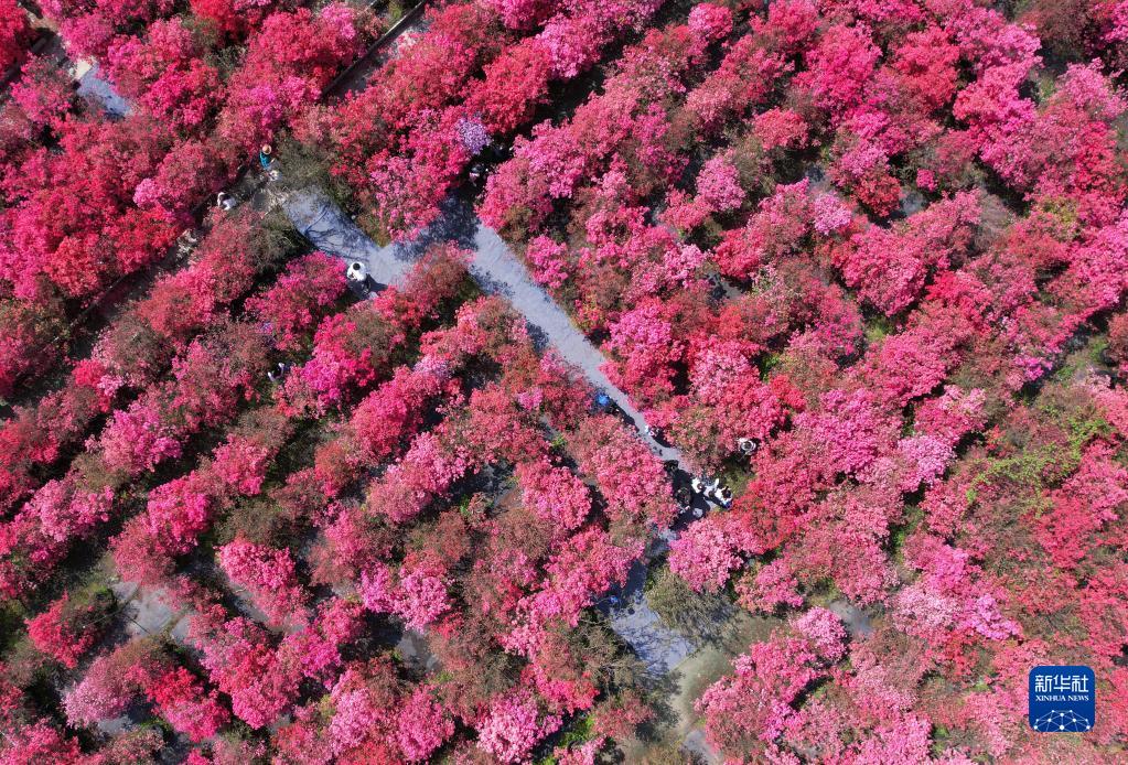 4月9日,人們在江蘇無錫九龍灣花彩小鎮“杜鵑花迷宮”中游玩賞花(無人機照片)。