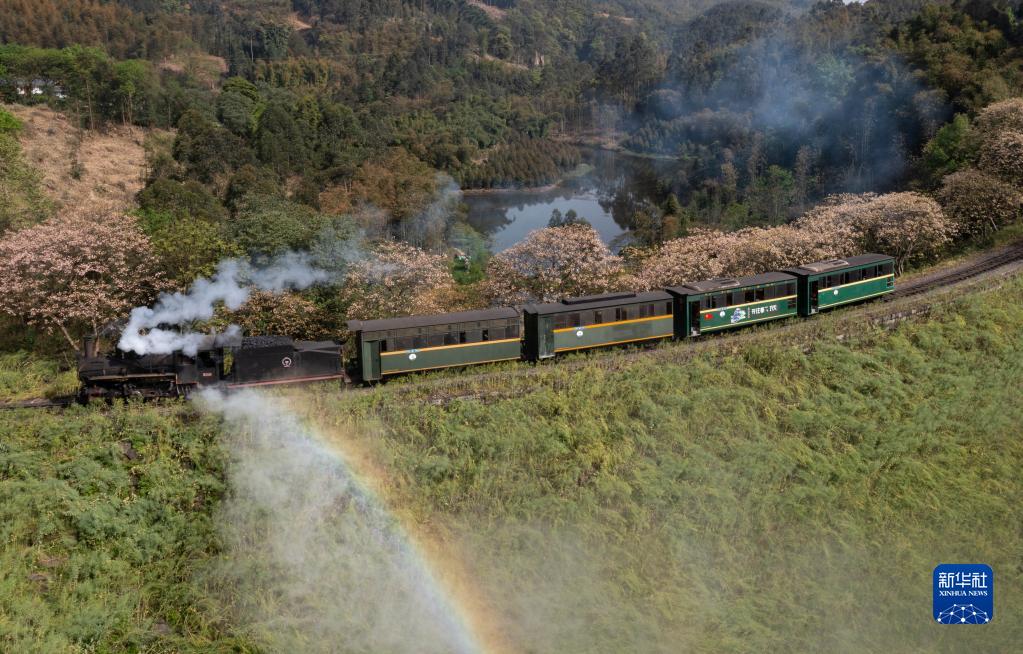 4月9日,一列嘉陽小火車經過亮水沱站的桐子花叢,噴出的蒸汽形成一道彩虹(無人機照片)。