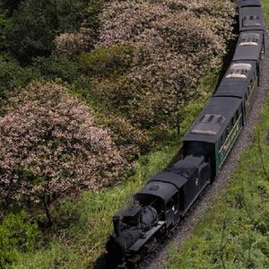 近日,四川省樂山市犍為縣桐子花盛開,當地著名的老式窄軌蒸汽火車——嘉陽小火車穿越桐子花叢,鳴笛噴氣,在陽光照射下形成一道彩虹,令人驚嘆不已。