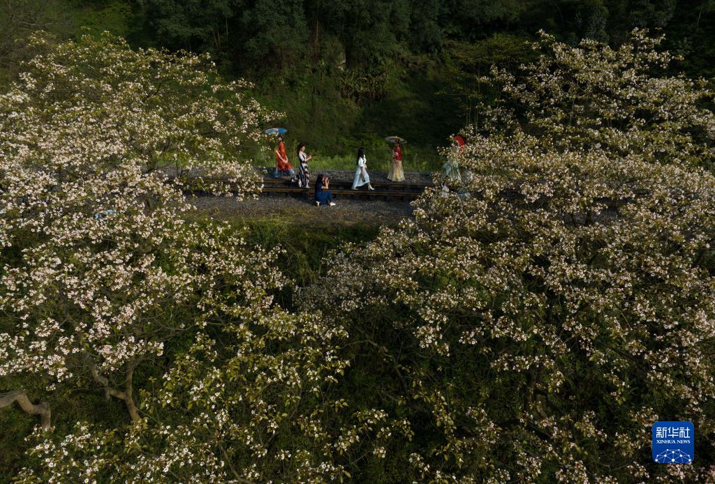 4月9日,游客們在亮水沱站的桐子花叢下徜徉(無人機照片)。