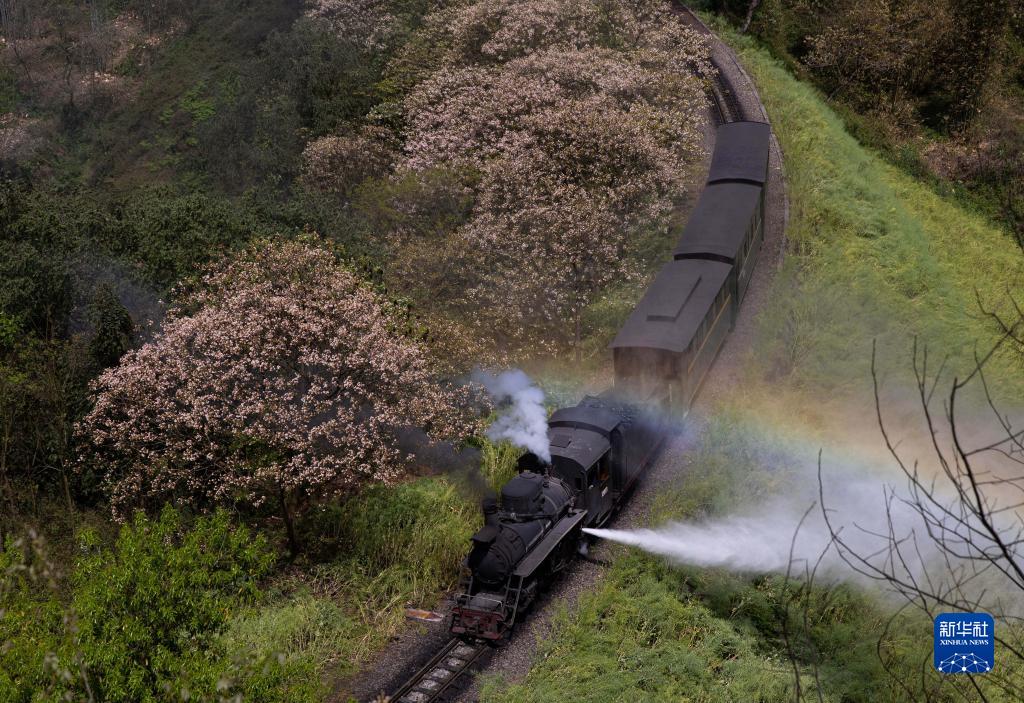 近日,四川省樂山市犍為縣桐子花盛開,當地著名的老式窄軌蒸汽火車——嘉陽小火車穿越桐子花叢,鳴笛噴氣,在陽光照射下形成一道彩虹,令人驚嘆不已。
