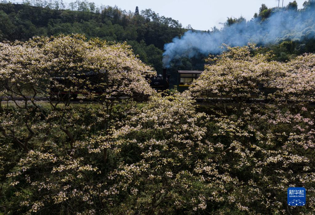 4月9日,一列嘉陽小火車經過亮水沱站的桐子花叢(無人機照片)。