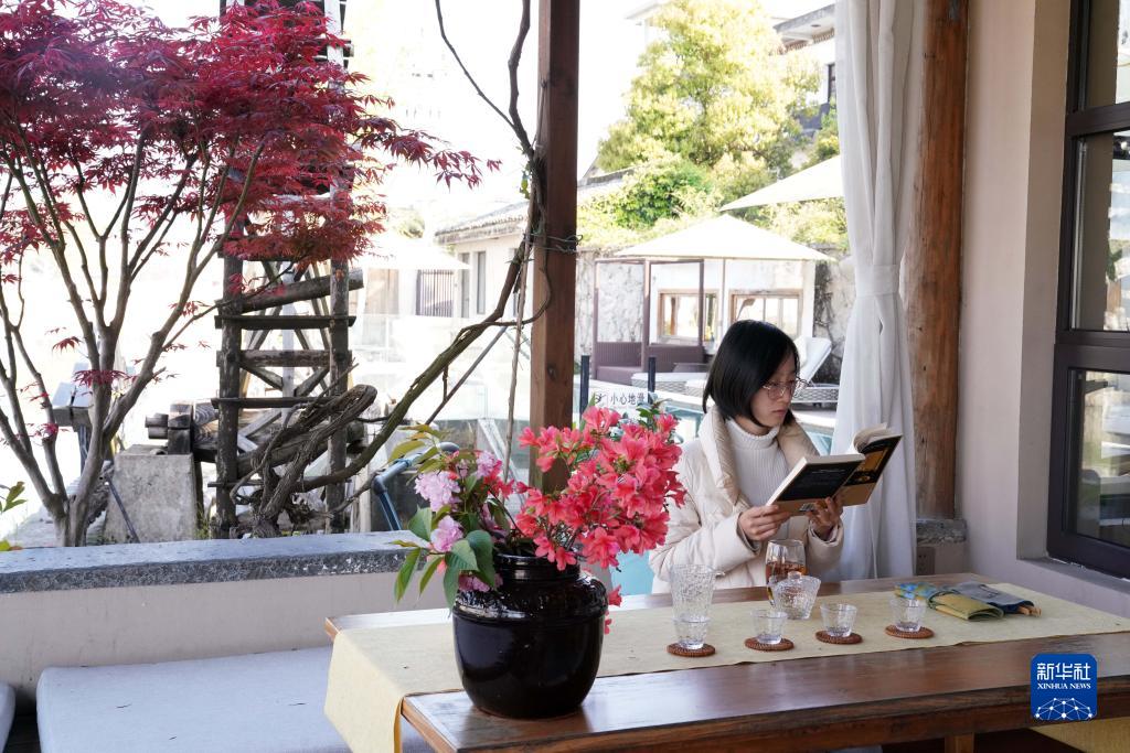 4月10日,一位客人在黟縣碧陽鎮的山水間·黑多白少民宿讀書。