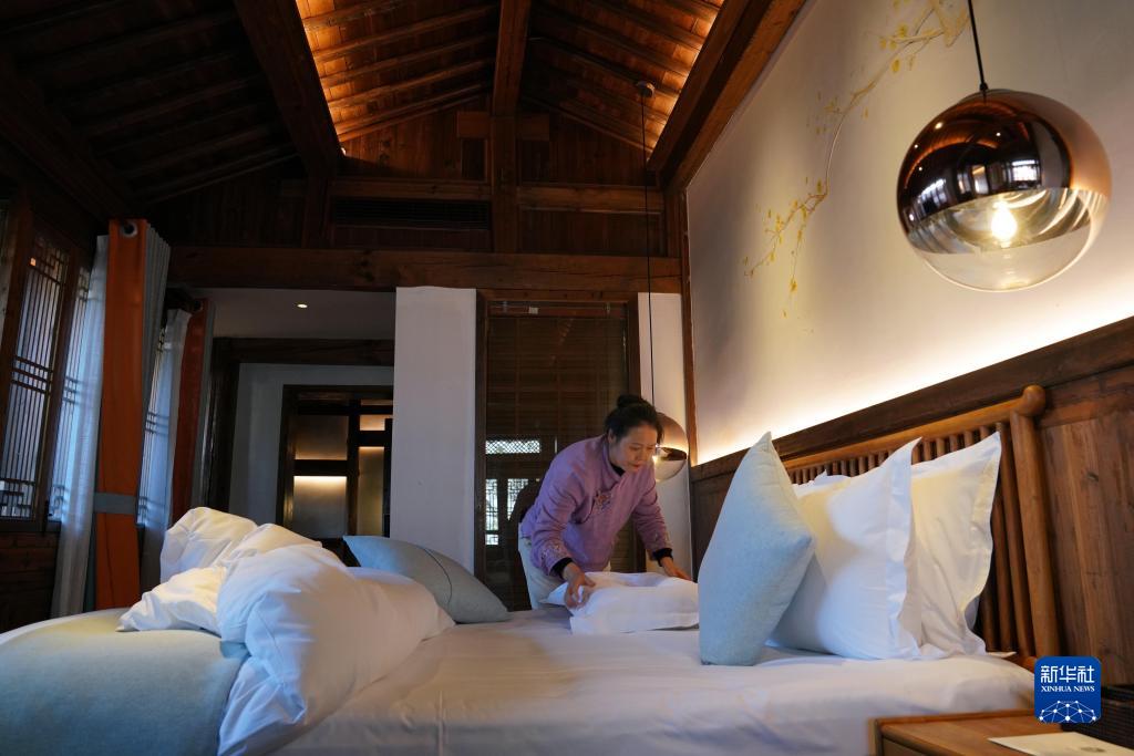 4月9日,在黟縣碧陽鎮石亭村的民宿拾庭畫驛,服務員吳翠蘭在整理房間。吳翠蘭是本地人,在家門口就業。