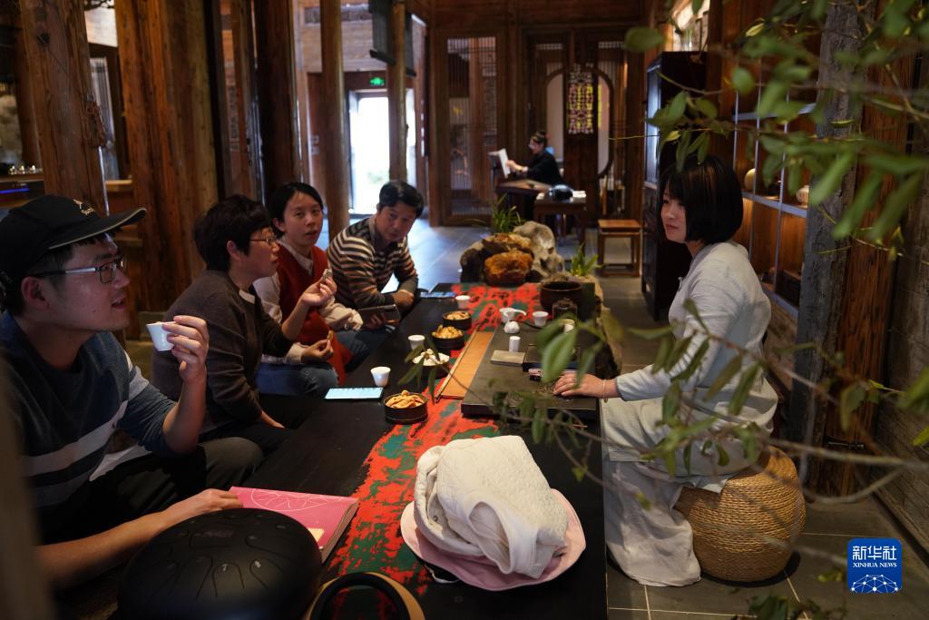 4月9日,在黟縣碧陽鎮石亭村的民宿拾庭畫驛,游客在品嘗徽式茶點。