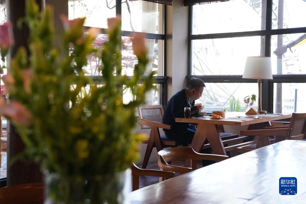 4月10日,一位客人在黟縣碧陽鎮的山水間·黑多白少民宿吃早餐。