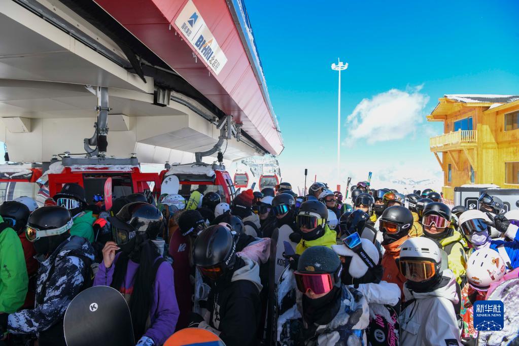 游客在新疆富蘊縣可可托海國際滑雪度假區排隊等候乘坐纜車(4月9日攝)。
