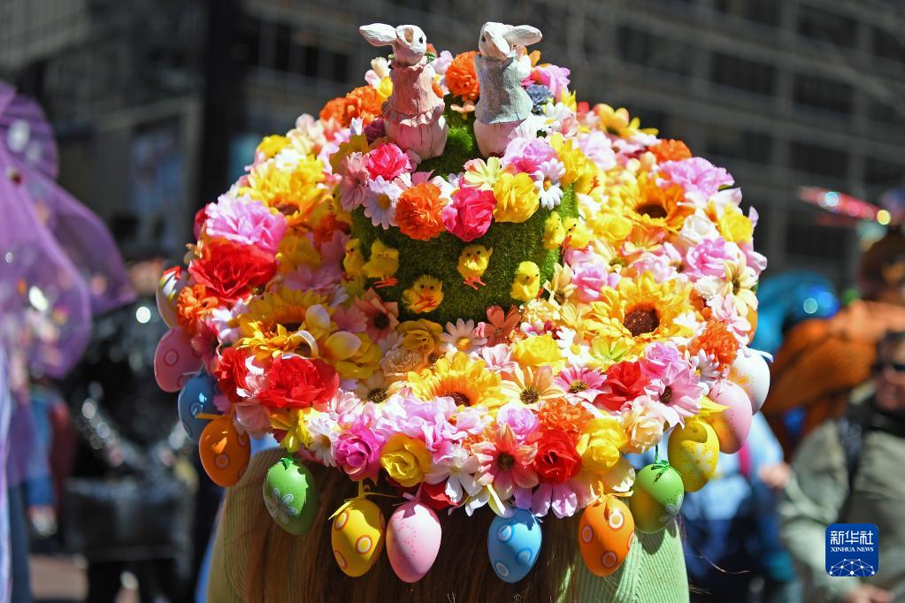 當日是西方傳統節日復活節,人們頭戴精心制作的花帽,在紐約第五大道參加一年一度的復活節游行。