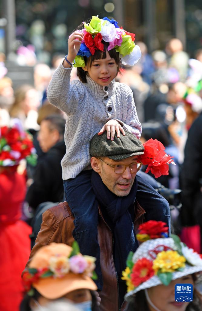 當日是西方傳統節日復活節,人們頭戴精心制作的花帽,在紐約第五大道參加一年一度的復活節游行。