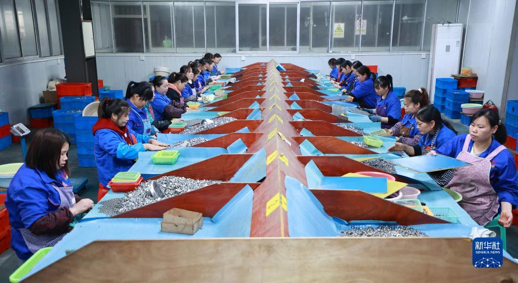 4月10日,搬遷群眾在獨山縣望城社區安置點附近的軸承產業園區內檢查成品軸承質量。