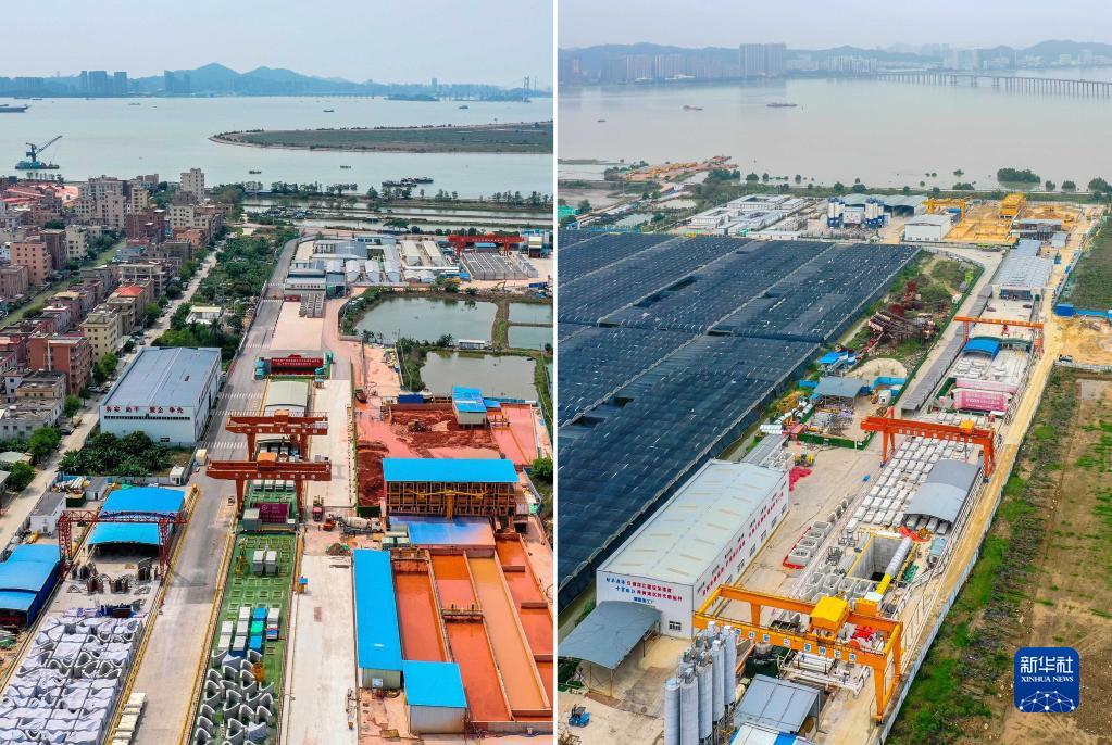 拼版照片:左圖為深江鐵路珠江口隧道東莞虎門段盾構起始點(4月7日攝,無人機照片),右圖為深江鐵路珠江口隧道廣州南沙段盾構起始點(4月10攝,無人機照片)。