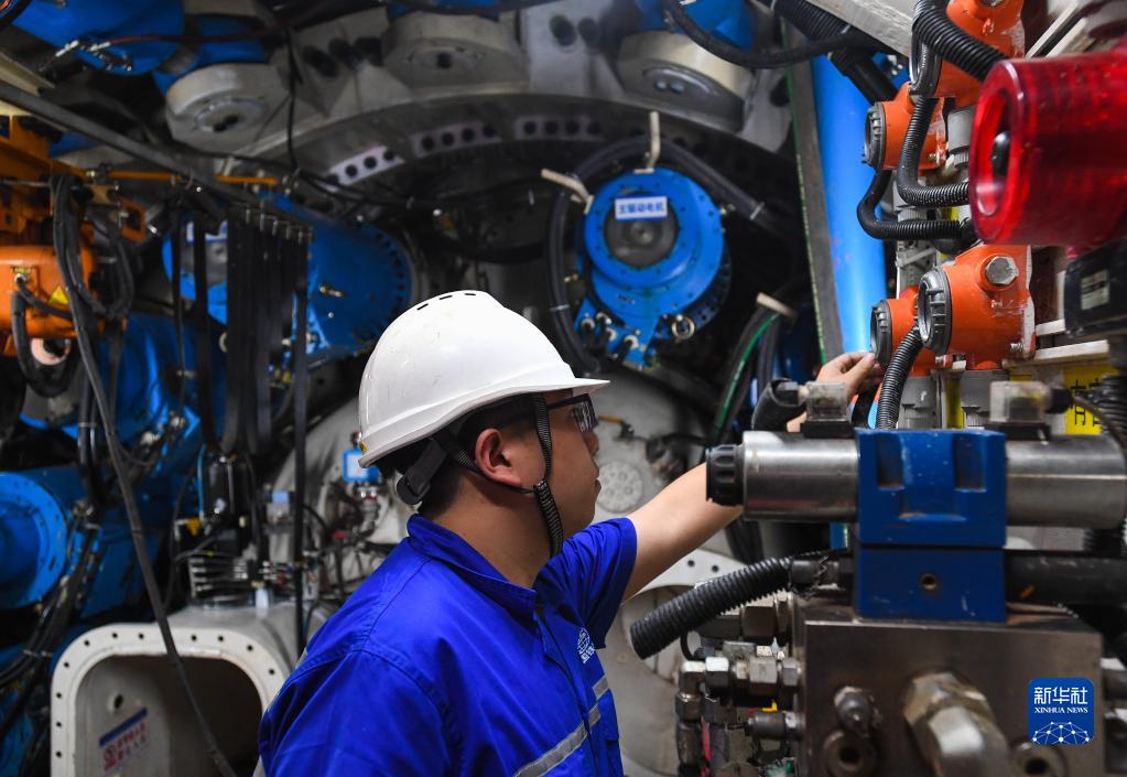 在深江鐵路珠江口隧道東莞虎門段,中鐵十四局施工人員在檢查“深江1號”盾構機運行狀況(4月7日攝)。