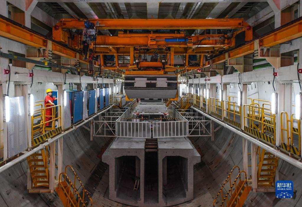 在深江鐵路珠江口隧道東莞虎門段,中鐵十四局施工人員吊運隧道管片(4月7日攝)。