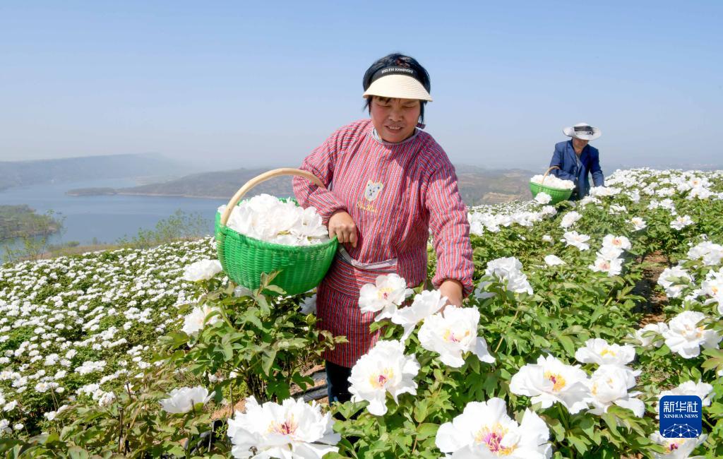 4月10日,在河南省洛陽市新安縣倉頭鎮郭莊村牡丹種植基地,花農忙著采摘牡丹花。