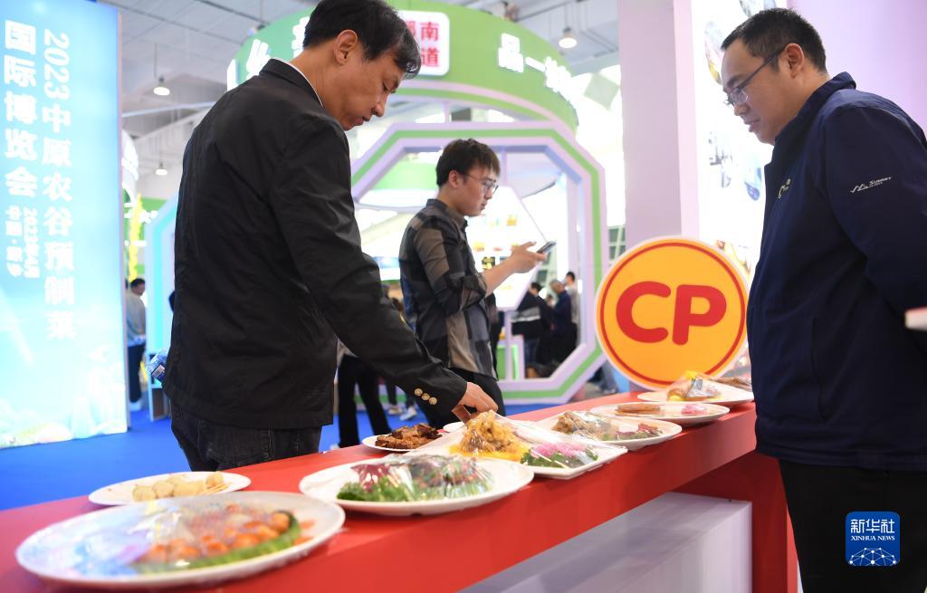 4月10日,參觀者在中原農谷預制菜國際博覽會上品嘗加工好的預制食品。