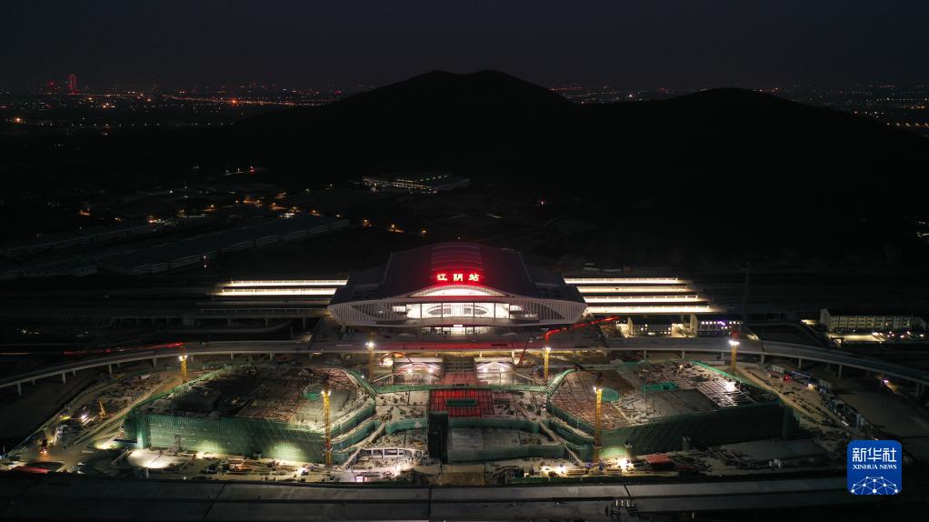 4月10日拍攝的滬寧沿江高鐵江陰站站房夜景(無人機照片)。