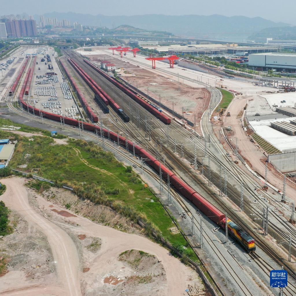4月10日,采用JSQ型車(專門運輸汽車整車的鐵路貨物車輛)的中歐班列從重慶魚嘴站發車(無人機照片)。