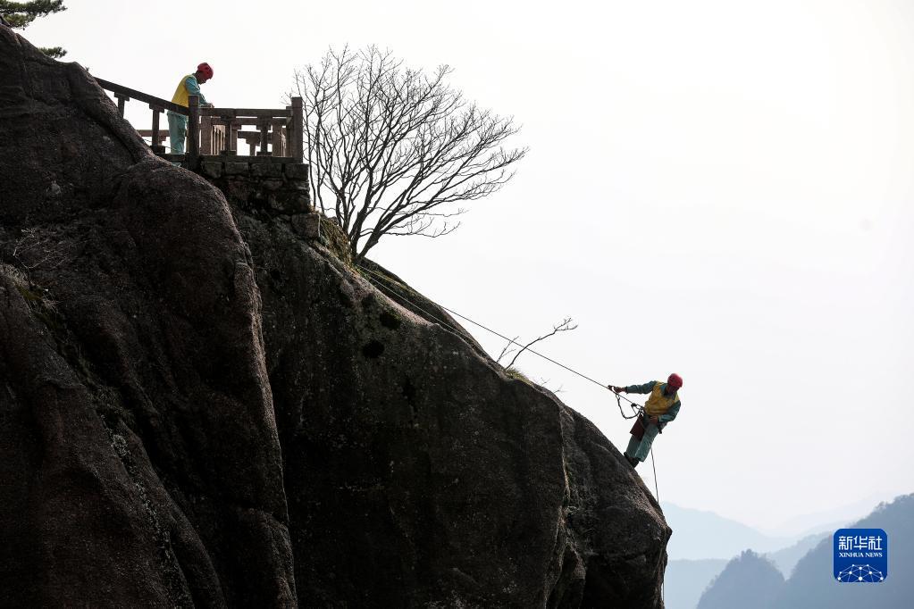 在安徽黃山風景區,有這樣一群特殊的環衛工,他們常年攀爬在懸崖峭壁間清理垃圾。玉屏環衛所的李培生是他們中的一員,20多年來,李培生累計放繩長度達1800公里,除了巡查并清理垃圾,還經常幫助游客撿拾掉下懸崖的物品,2012年被評為“中國好人”。黃山風景區一共有18名像李培生這樣的放繩工,他們用辛勤的汗水守護著黃山的美麗。
