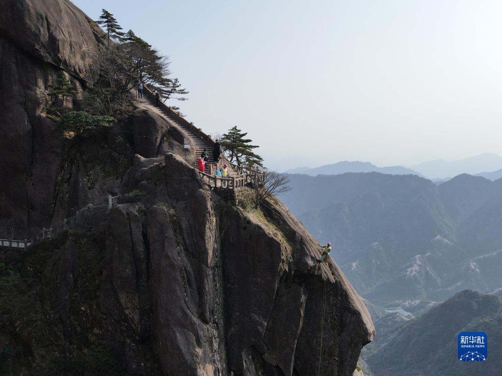4月10日,李培生(下)和同事陳國偉(上)在黃山風景區的懸崖峭壁上清撿垃圾(無人機照片)。