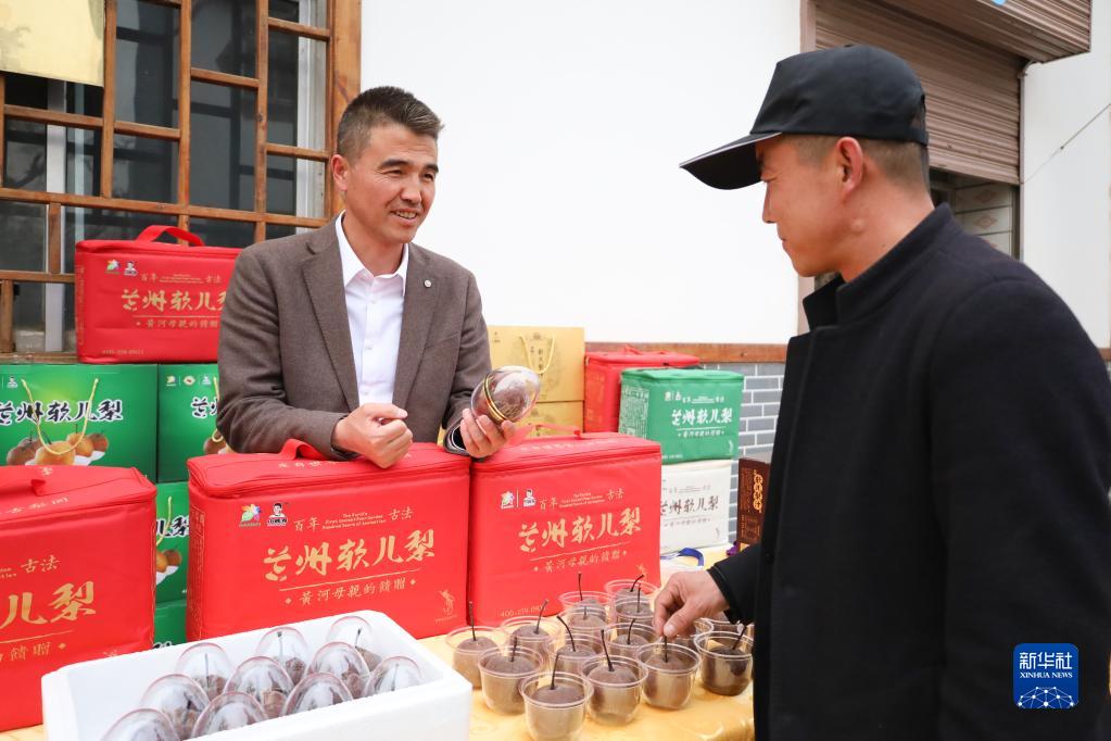 4月10日,在蘭州市皋蘭縣什川古梨園里的商品街,商戶為游客推介什川鎮特色農產品軟兒梨。