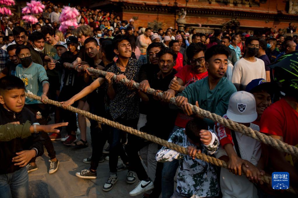 4月10日,在尼泊爾中部加德滿都谷地的巴克塔普爾,參加新年慶典的人們在傳統的慶?;顒由虾狭ν献Ь薮蟮纳裣駪疖?。