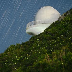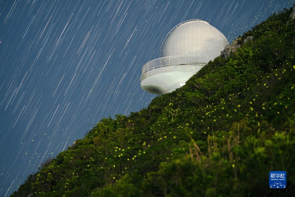 位于西涌社區的深圳市天文臺以及螢火蟲與星空(堆棧照片,2021年7月7日攝)。