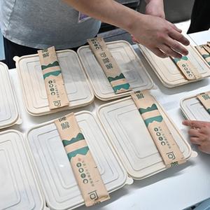 4月11日,消博會海南展臺的工作人員展示全降解產品。