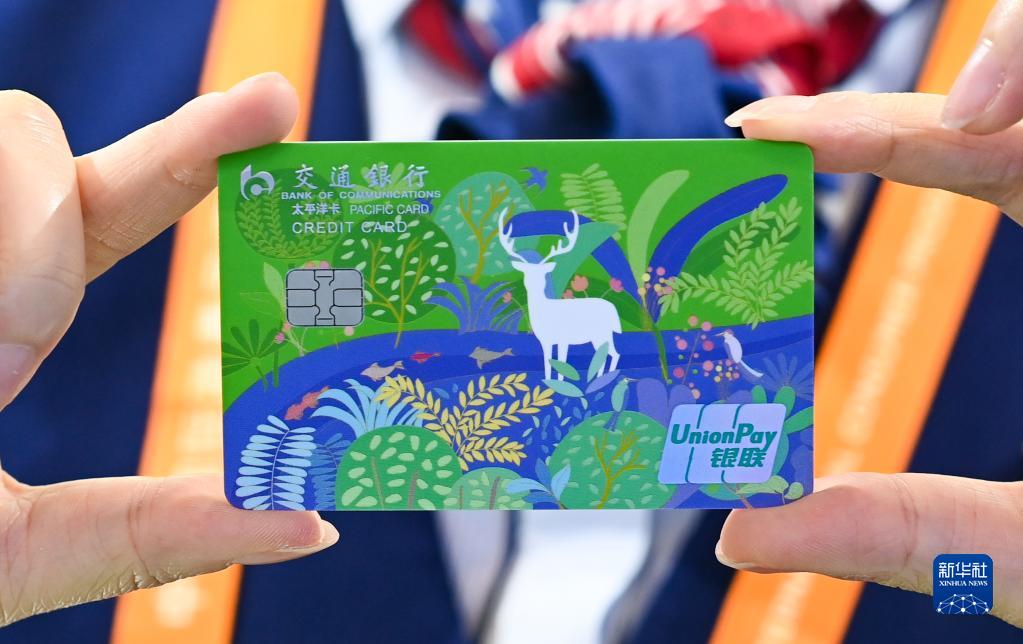 交通銀行工作人員展示交通銀行綠色低碳主題信用卡,該產品卡面使用了可降解的環??ɑ?月10日攝)。
