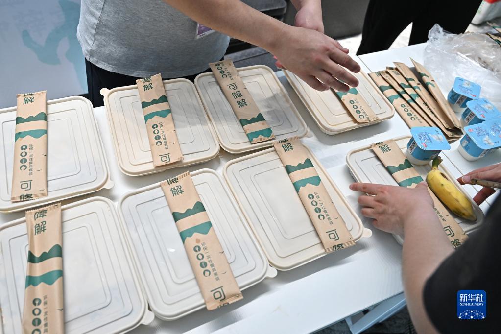 4月11日,在消博會就餐區,與會者領取用可降解餐盒包裝的午餐。