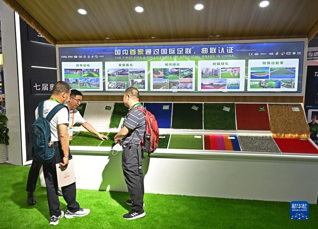 4月11日,在消博會的泰山體育展臺,工作人員向參觀者介紹可以釋放負氧離子的人造草坪。