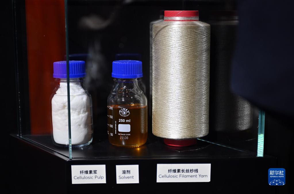 這是消博會上一家服飾品牌展示的可代替聚酯和尼龍纖維的可降解制衣材料(4月11日攝)。