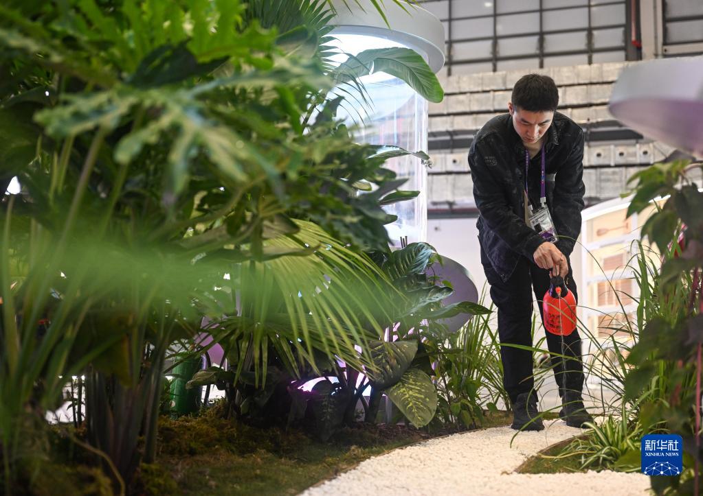 工作人員為種植在消博會展臺上的綠植澆水(4月8日攝)。