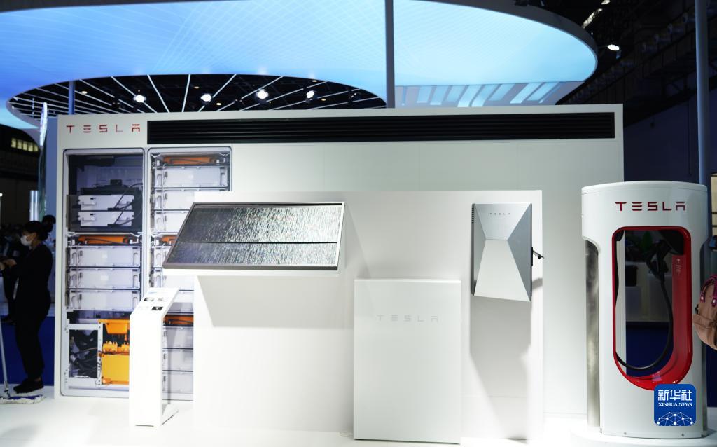 這是特斯拉的全方位能源供應展區,所展出產品包括太陽能屋頂、家用儲能電池及充電樁(4月11日攝)。