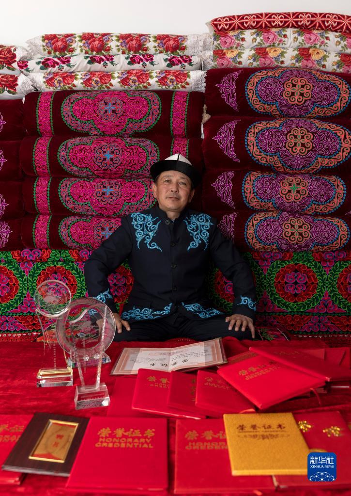 4月10日,在阿合奇村,阿不都別克展示自己獲得的《瑪納斯》演唱比賽獲獎證書和獎杯。