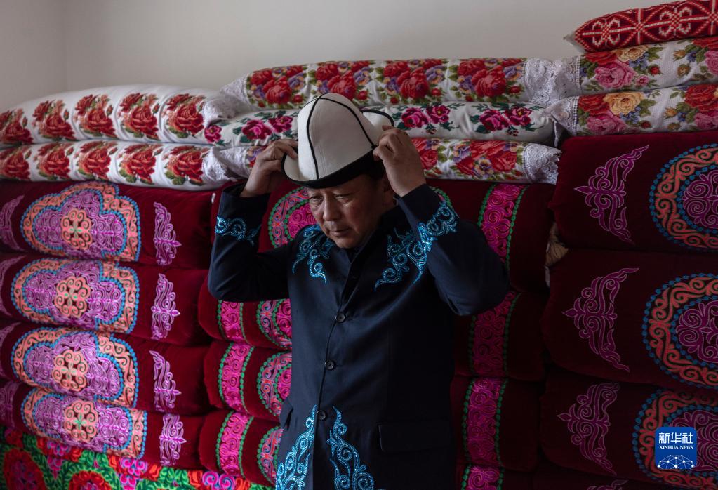 4月10日,在阿合奇村,阿不都別克穿上柯爾克孜族服裝,準備去參加表演。