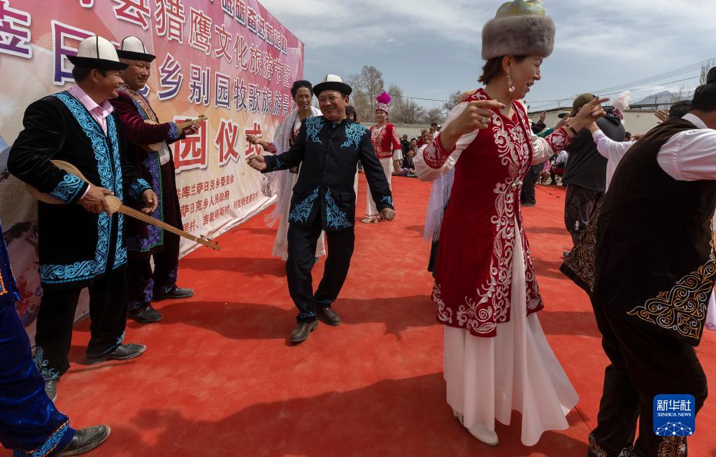 4月10日,在別迭里村,阿不都別克(中)和藝人們、觀眾在演出結束后一起跳舞。