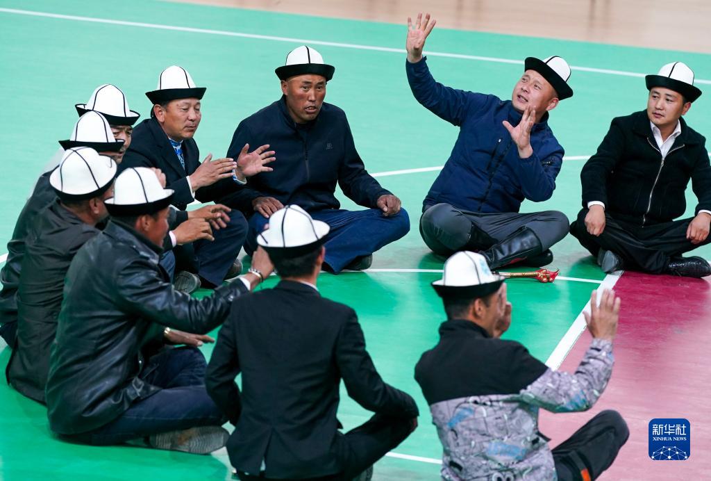 4月10日,在阿合奇縣科技文化體育中心,《瑪納斯》傳承人在進行排練。