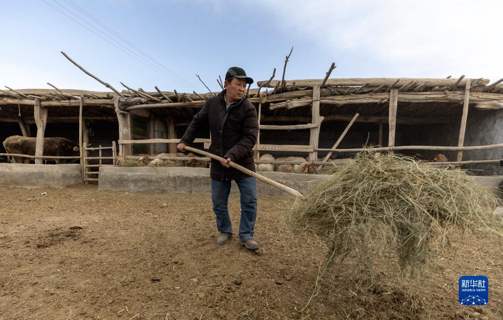 4月10日清晨,在阿合奇村,阿不都別克在喂羊。