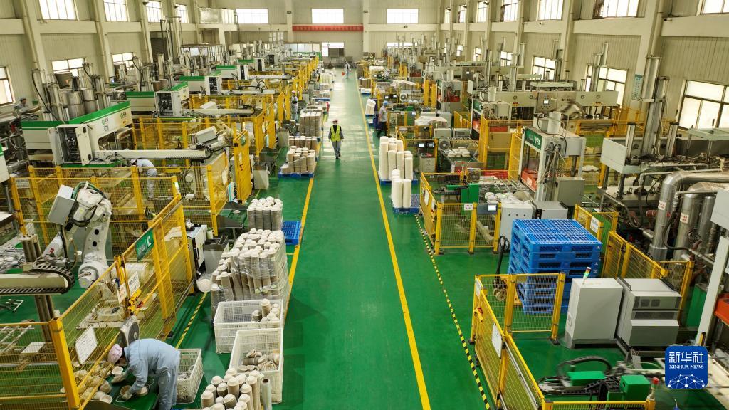 4月11日,在位于山東省滕州市西崗鎮的一家企業,工人生產以秸稈為原料的可降解餐盤(無人機照片)。