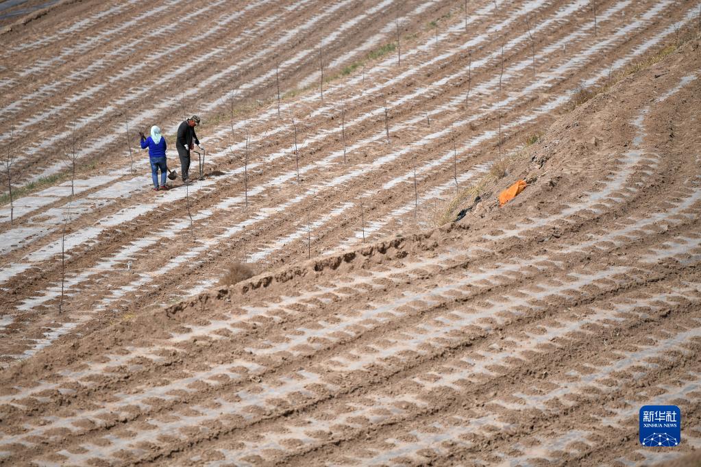 4月11日,在靜寧縣紅寺鎮胡溝村,村民在高標準農田里勞作。