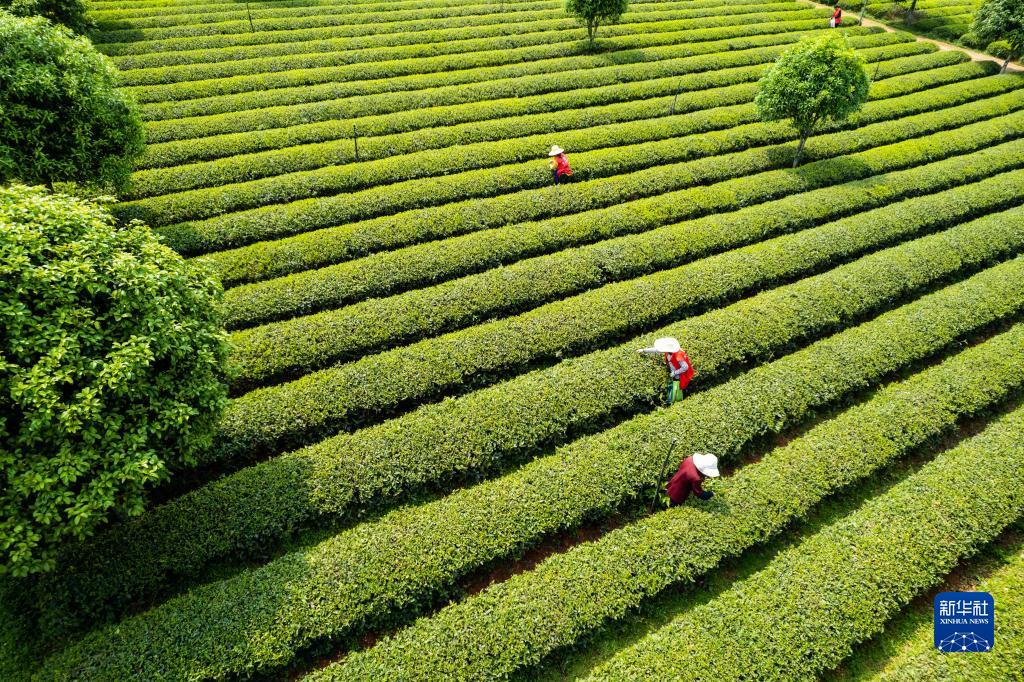 4月11日,在長沙望城烏山貢茶基地,茶農在采摘春茶(無人機照片)。