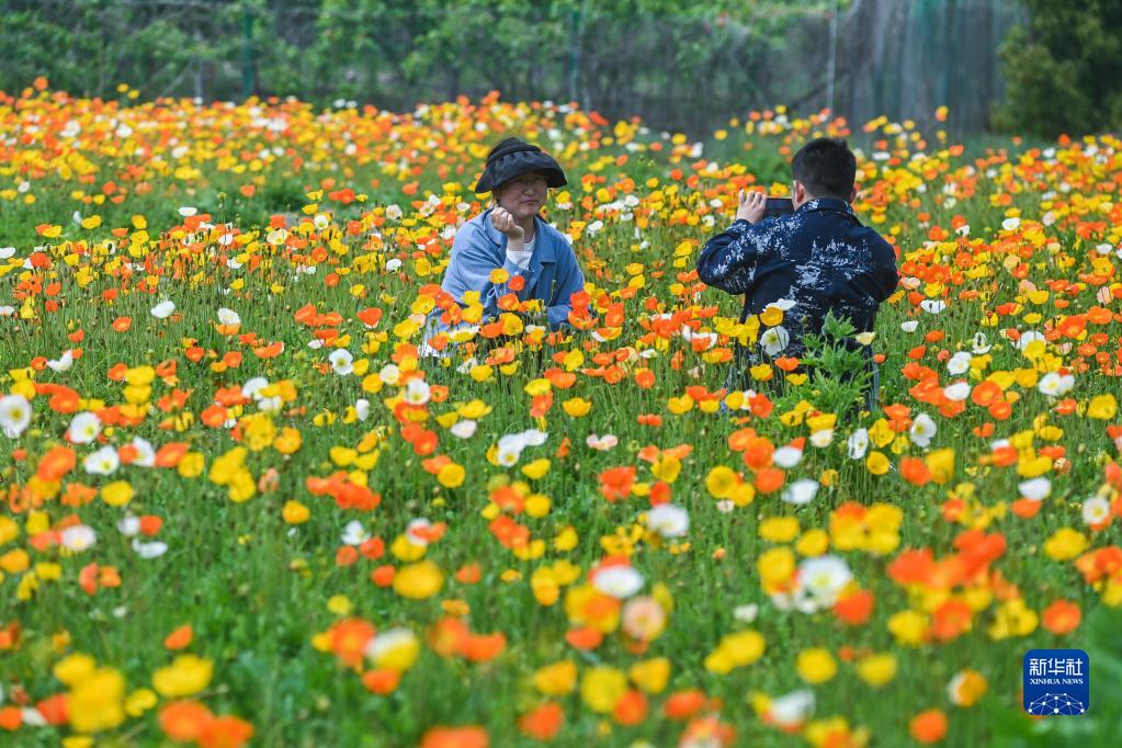 4月11日,游客在織里鎮廟兜村的花海中拍照留影。