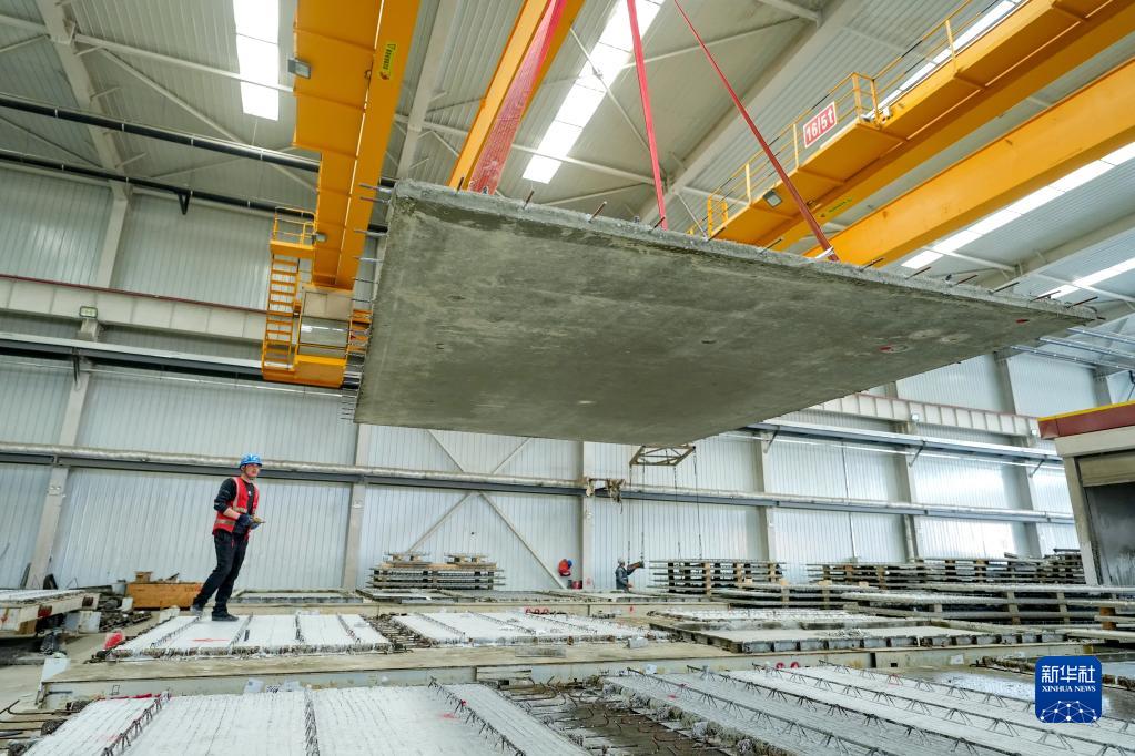 4月11日,河北省玉田縣一家裝配式建筑制造企業的工人在吊運產品。