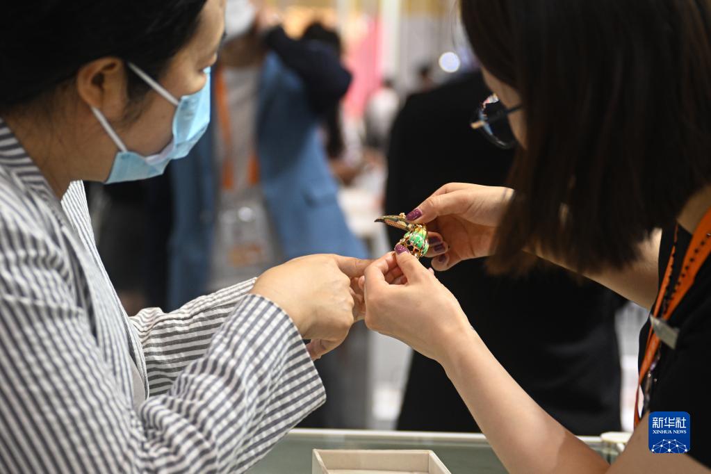 4月11日,在消博會意大利企業館,工作人員(右)向觀眾介紹來自意大利的珠寶產品。