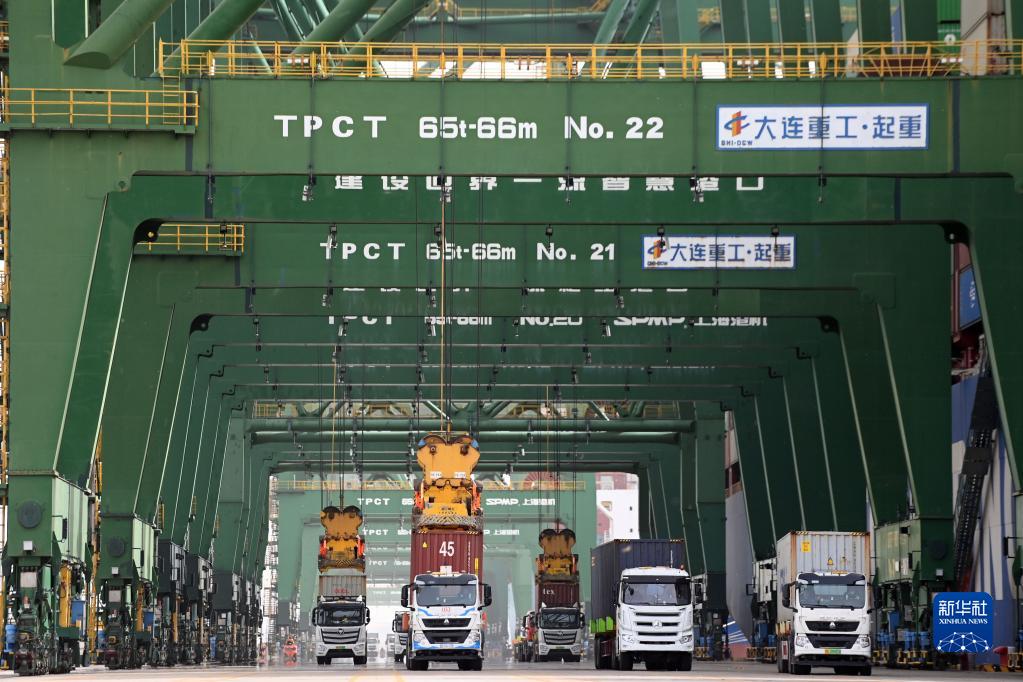 4月11日,卡車在天津港太平洋國際集裝箱碼頭運輸集裝箱。